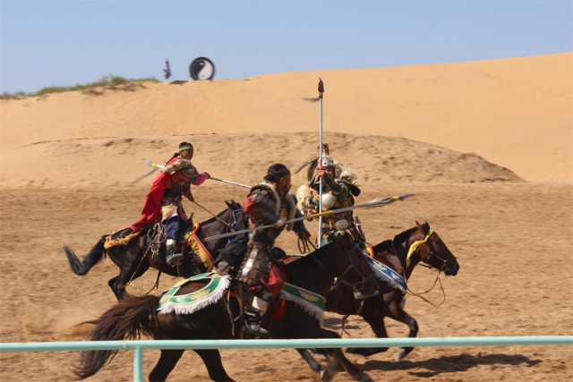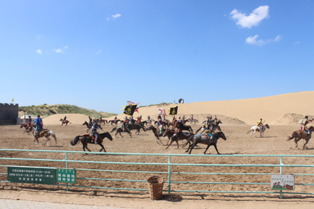 團(tuán)體游戲熱身后前往神泉旅游景區(qū)通過(guò)坐索道過(guò)黃河,到庫(kù)布其沙漠觀看大型馬術(shù)實(shí)景劇《永遠(yuǎn)的成吉思汗》、沙漠沖浪、滑沙、騎駱駝等民族特有的娛樂(lè)項(xiàng)目。